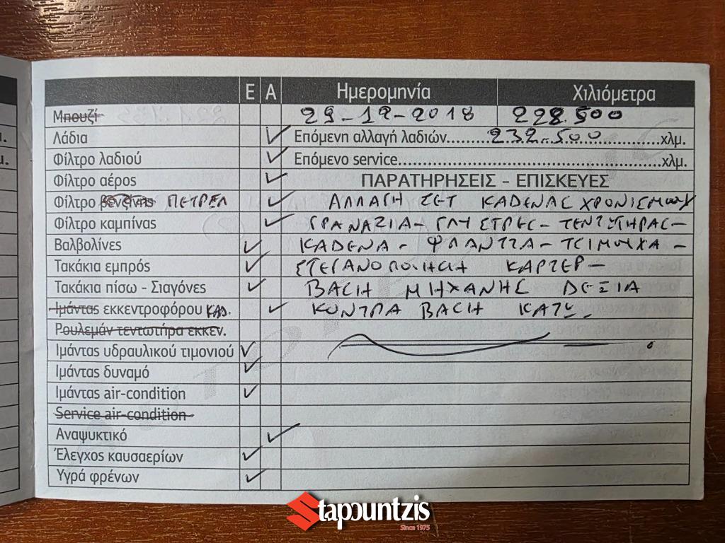 Σε πολύ καλή κατάσταση με όλα τα service καταχωρημένα σε βιβλίo επισκευών και συντήρησης ενδελεχώς καταχωρημένα με το τελευταίο να έχει πραγματοποιηθεί προ 100χιλιομέτρων όπου αντικαταστάθηκαν η αντλία υδραυλικού τιμονιού ιμάντας τιμονιού υγρό τιμονιού ενώ προ 20000 χιλιομέτρων αντικαταστάθηκαν σετ καδένας χρονισμού συμπεριλαμβανομένων γρανάζια, γλίστρες τεντοτήρας, φλάντζα καθρέφτη με στεγανοποίηση κάρτερ καθώς και δύο βάσεις μηχανής όπως και τα εμπρόσθια αμορτισέρ. Δεκτός κάθε έλεγχος.